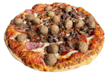 Our Meat Lovers Pizza is a carnivore's delight, piled high with juicy sausage, Canadian Bacon, ground beef, savory Meat Balls, and tender pepperoni, all smothered in melted mozzarella cheese on top of our artisanal crust that will satisfy any hungry stomach.