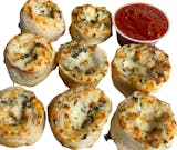 Garlic knots stuffed with Mozzarella cheese are savory delights, featuring soft, aromatic knots of dough infused with rich garlic flavor and oozing with gooey melted Mozzarella. These irresistible bites combine the warmth of freshly baked bread with the indulgence of melted cheese. They are served with a side of marinara sauce.
